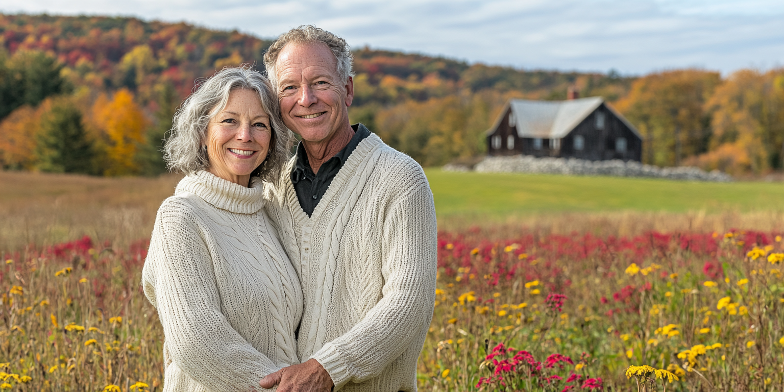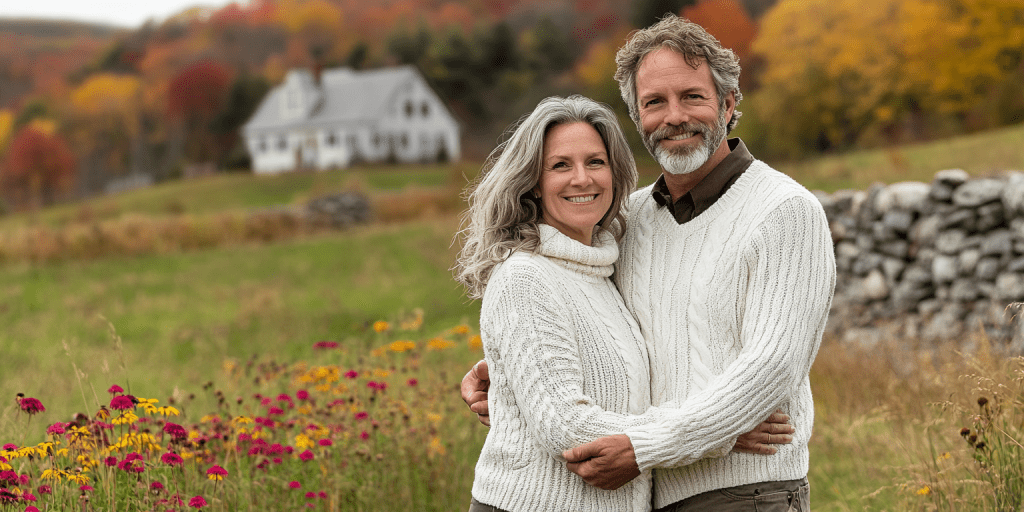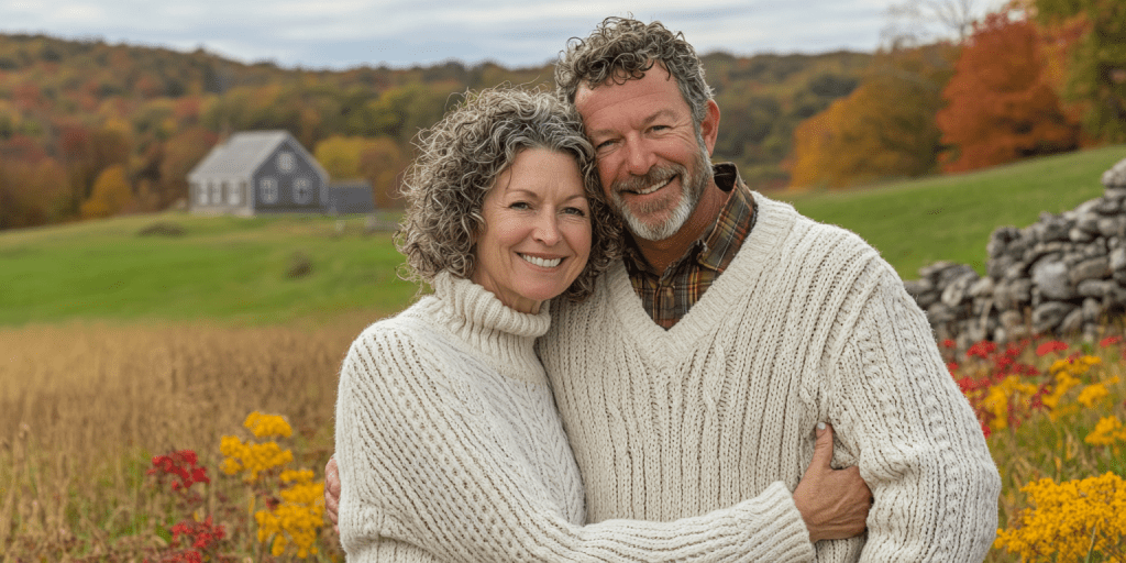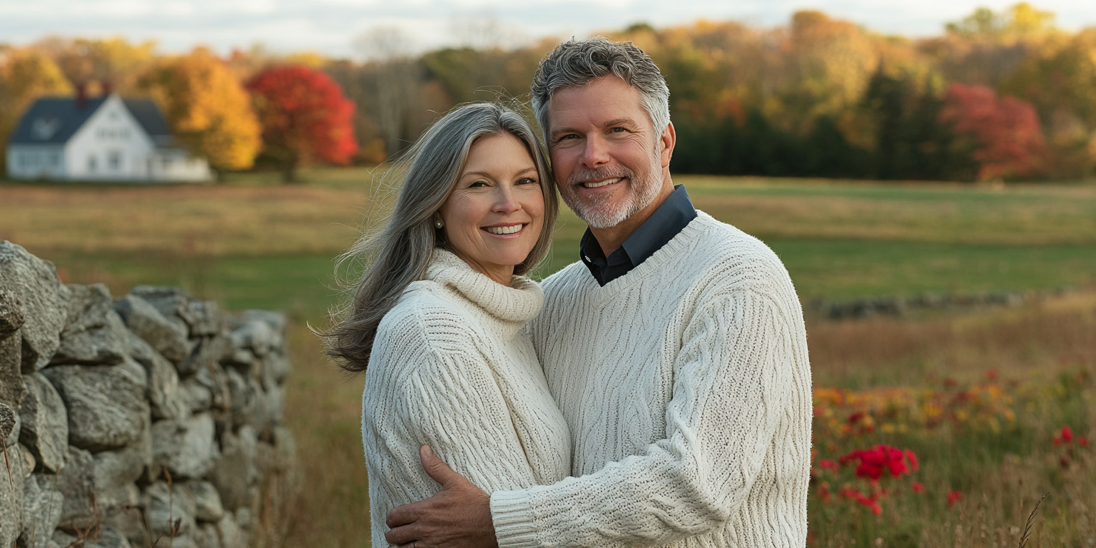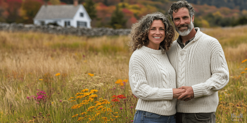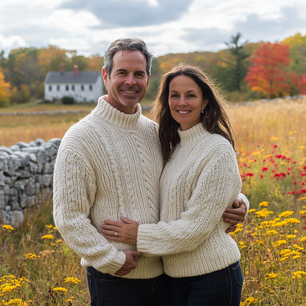 “a photograph of a couple posing for the camera holding each other, they both wear thick white cable knit sweaters and are in their mid-forties. She is a beautiful, tall and willowy woman, he is clean shaven, rugged and handsome, they stand in a new england field with long grass and brightly colored wildflowers, in autumn, they look towards the camera, there are fieldstone walls in the background and a row of trees at the back of the field showing fall colors in red and yellow, and a small colonial house visible in the distance. There is depth in the photograph, with the house being positioned off in the distance, with rolling hills in between the couple and the house. –ar 2:1 –v 5.1”