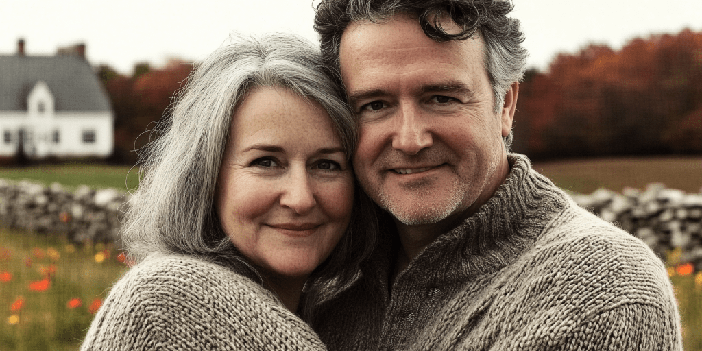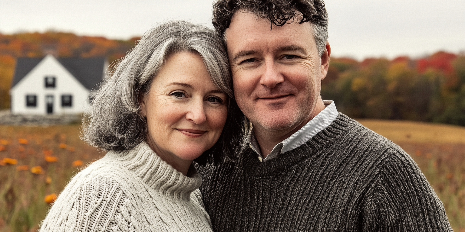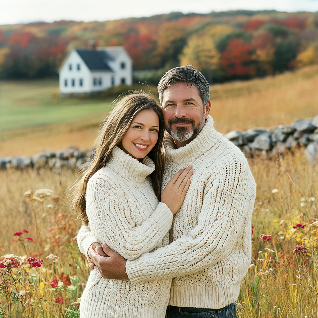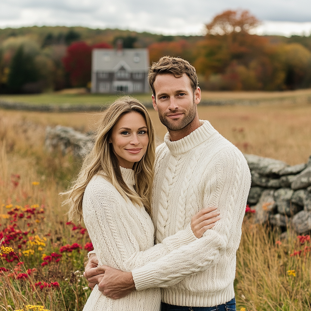 https://s.mj.run/F9kR5x8XeRMhttps://s.mj.run/6oUsxj-acqshttps://s.mj.run/M33VDlt9f2khttps://s.mj.run/dKDRmKwbioI a photograph of a couple in their forties wearing thick white cable knit sweaters, posing for the camera holding each other, she is a beautiful, tall and willowy woman , he is tall clean shaven, rugged and handsome, they stand in a new england field with long grass and brightly colored wildflowers, in autumn, they look towards the camera, there are stone walls in the background and a row of trees showing fall colors in red and yellow, and a small colonial house visible in the distance. –ar 2:1 –v 5.1 –
