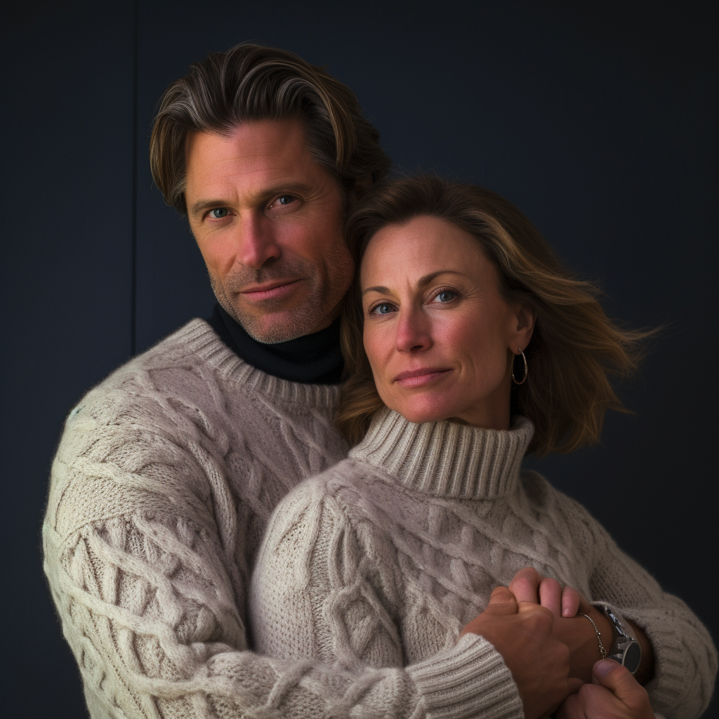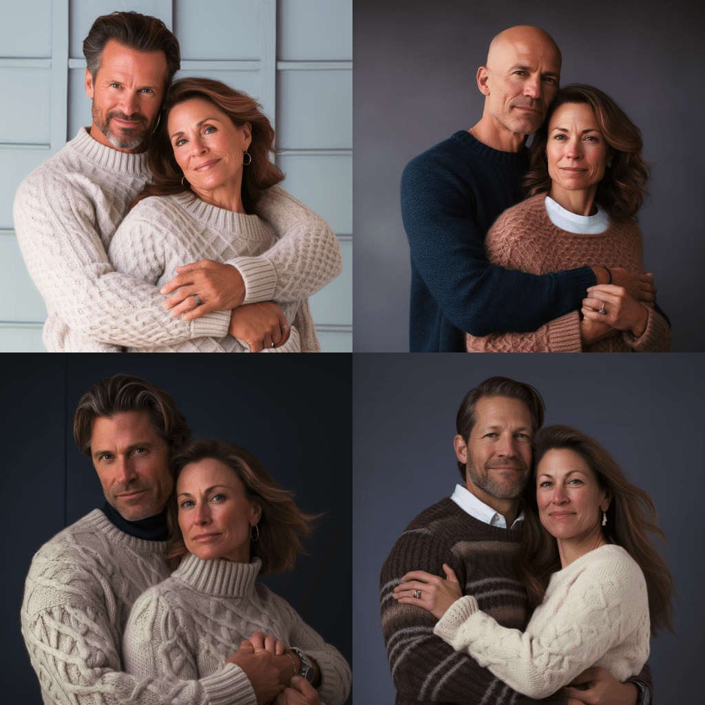 https://s.mj.run/ePXrbTX226chttps://s.mj.run/DDmJPXMNGS0 photographic portrait of a couple in their forties arm in arm, he is clean shaven rugged and handsome in a thick white cable knit sweater, she is tall and willowy in her late thirties wearing a fall colored sweater –v 5.1 – Image #2