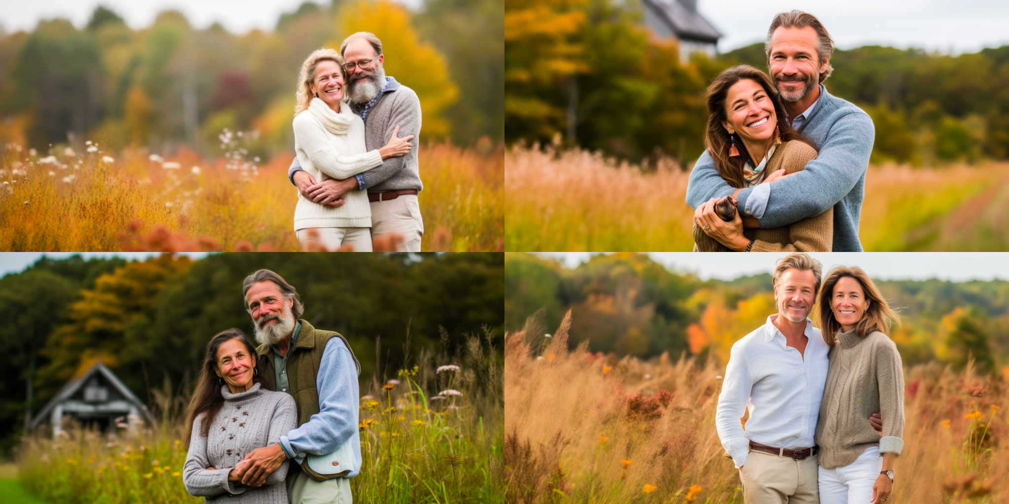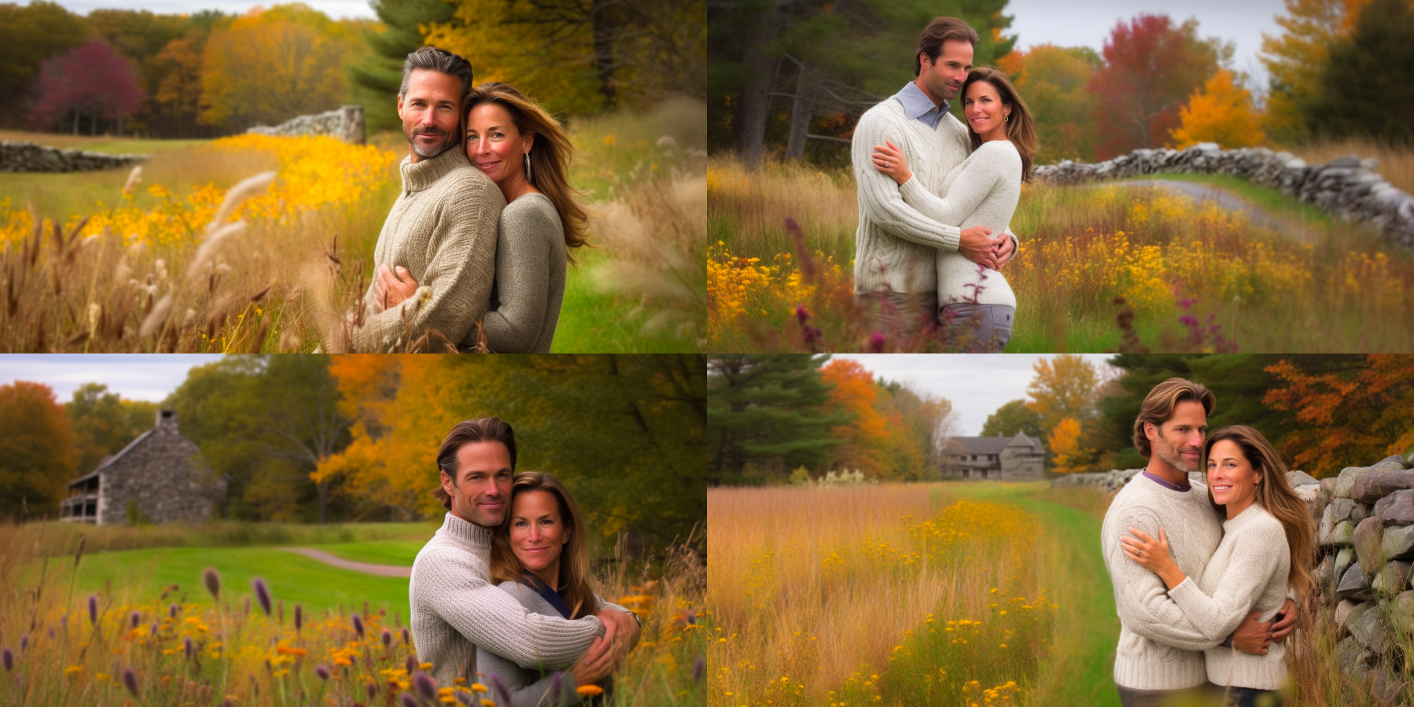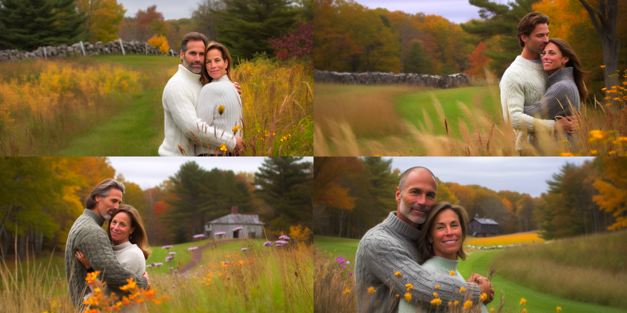 https://s.mj.run/F9kR5x8XeRMhttps://s.mj.run/6oUsxj-acqshttps://s.mj.run/M33VDlt9f2khttps://s.mj.run/dKDRmKwbioI a photograph of a couple in their forties wearing thick white cable knit sweaters, posing for the camera holding each other, she is a beautiful, tall and willowy woman , he is tall clean shaven, rugged and handsome, they stand in a new england field with long grass and brightly colored wildflowers, in autumn, they look towards the camera, there are stone walls in the background and a row of trees showing fall colors in red and yellow, and a small colonial house visible in the distance. –ar 2:1 –stylize 1000 –v 5.1 – Image #2