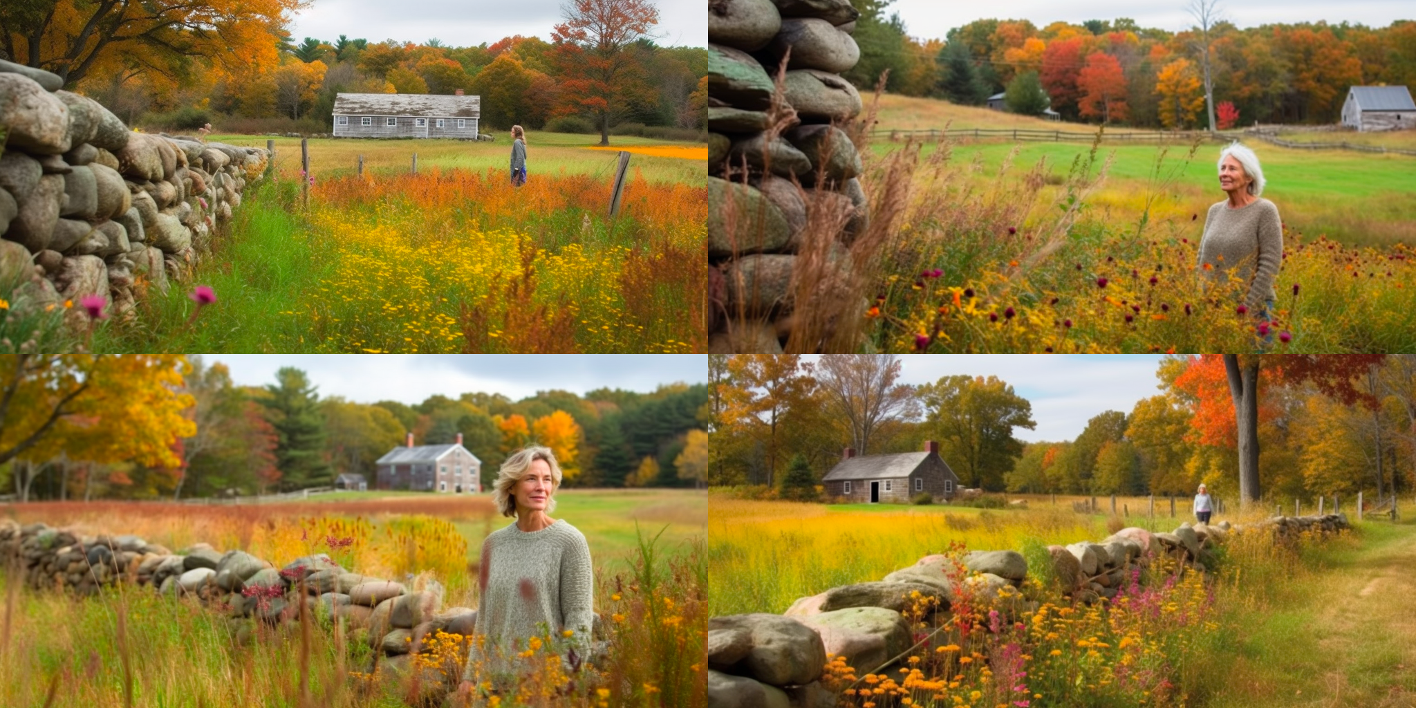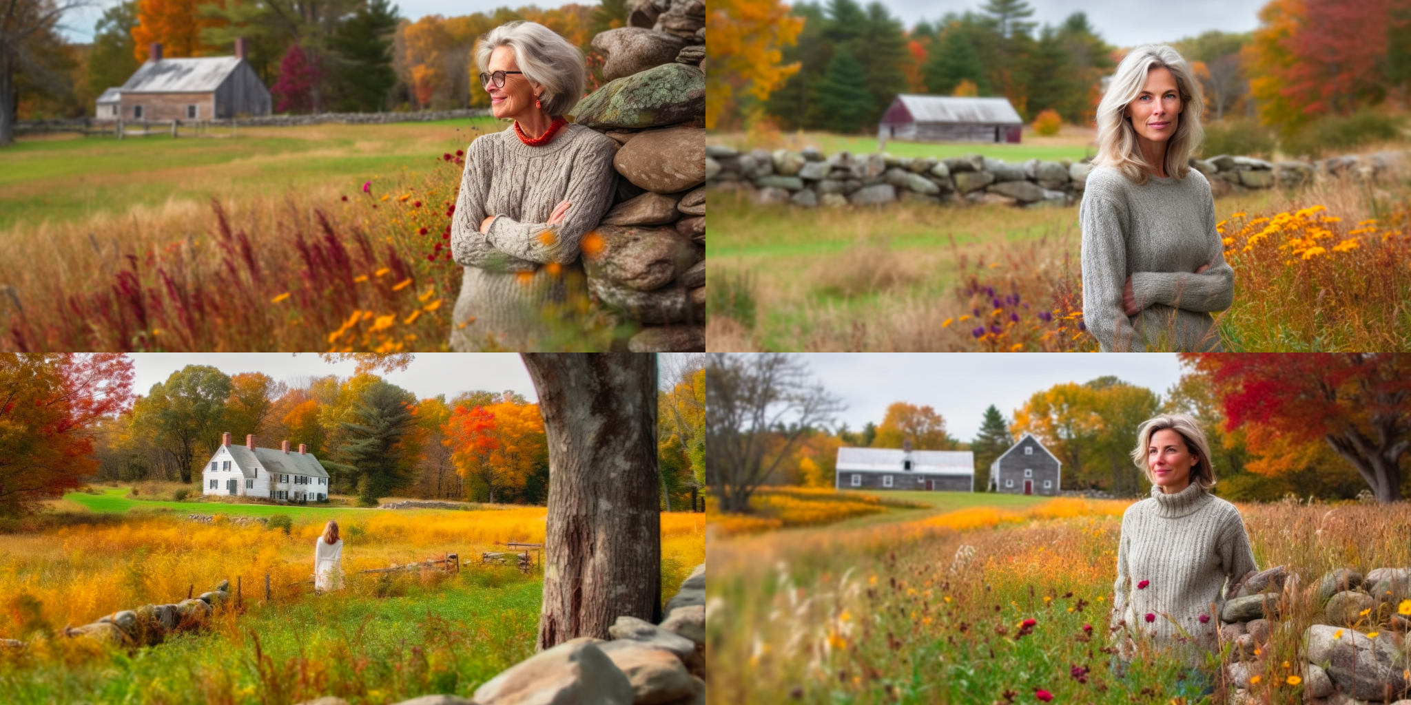 https://s.mj.run/DDmJPXMNGS0https://s.mj.run/6oUsxj-acqshttps://s.mj.run/M33VDlt9f2khttps://s.mj.run/dKDRmKwbioI a photograph of a beautiful and willowy woman in a thick white cable knit sweater in her forties, stands in a new england field with long grass and brightly colored wildflowers, in autumn, he looks towards the camera, there are stone walls in the background and a row of trees showing fall colors in red and yellow, and a small colonial house visible in the distance. –ar 2:1 –stylize 1000 –v 5.1 –