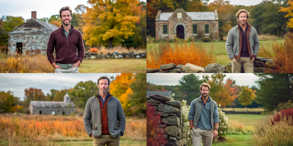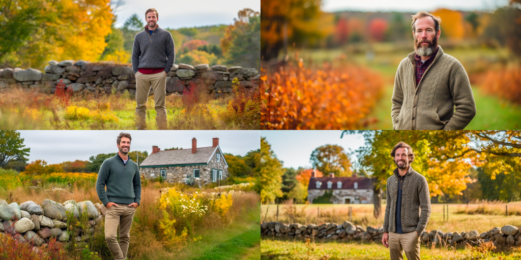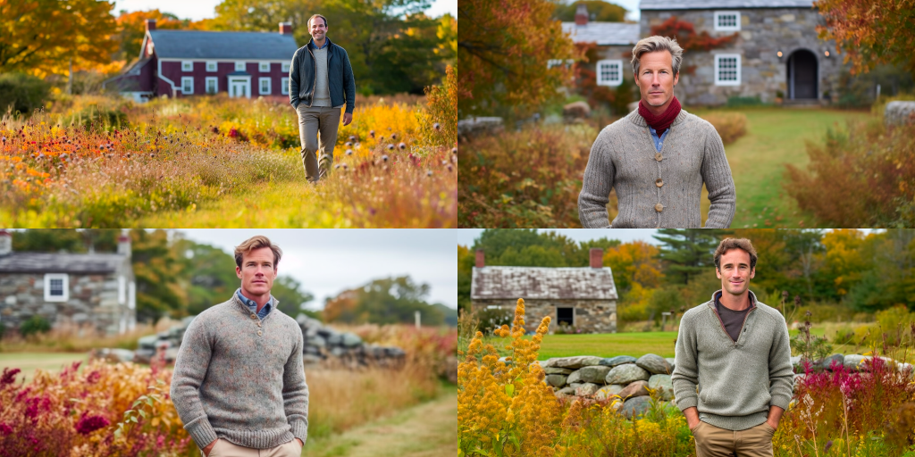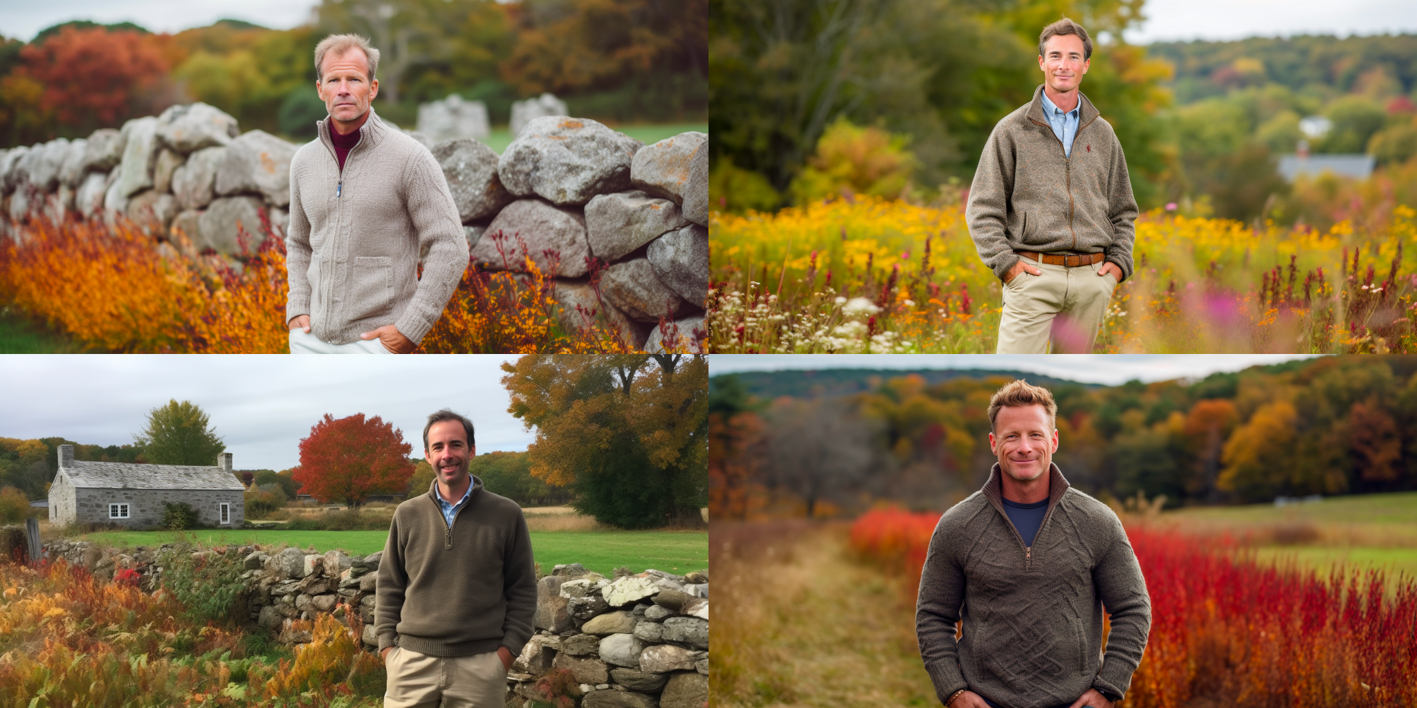 https://s.mj.run/ePXrbTX226chttps://s.mj.run/6oUsxj-acqshttps://s.mj.run/M33VDlt9f2khttps://s.mj.run/dKDRmKwbioI a photograph of a handsome and rugged clean shaven tall man in a thick white cable knit sweater in his forties with broad shoulders, stands in a new england field with long grass and brightly colored wildflowers, in autumn, he looks towards the camera, there are stone walls in the background and a row of trees showing fall colors in red and yellow, and a small colonial house visible in the distance. –ar 2:1 –stylize 1000 –v 5.1 –