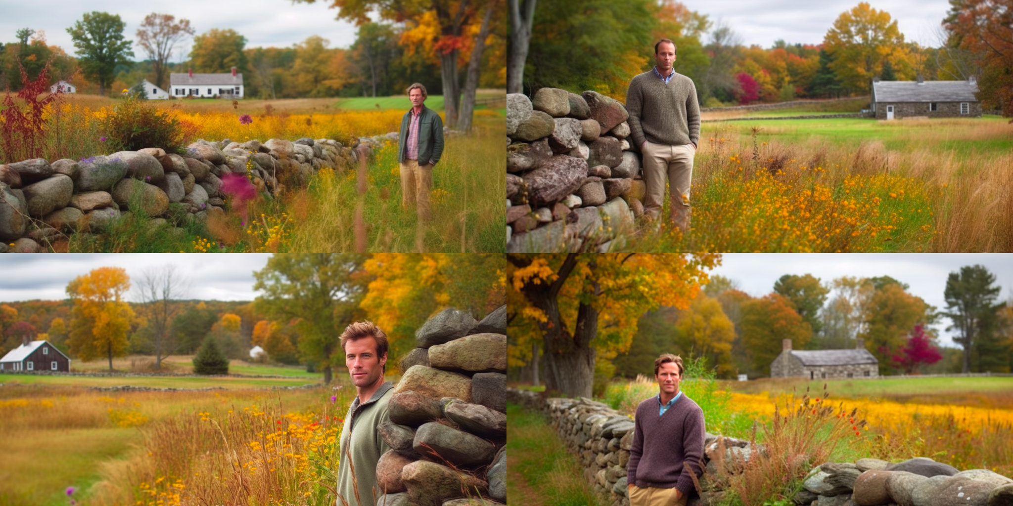https://s.mj.run/ePXrbTX226chttps://s.mj.run/6oUsxj-acqshttps://s.mj.run/M33VDlt9f2khttps://s.mj.run/dKDRmKwbioI a photograph of a handsome and rugged clean shaven tall man in a thick white cable knit sweater in his forties with broad shoulders, stands in a new england field with long grass and brightly colored wildflowers, in autumn, he looks towards the camera, there are stone walls in the background and a row of trees showing fall colors in red and yellow, and a small colonial house visible in the distance. –ar 2:1 –v 5.1