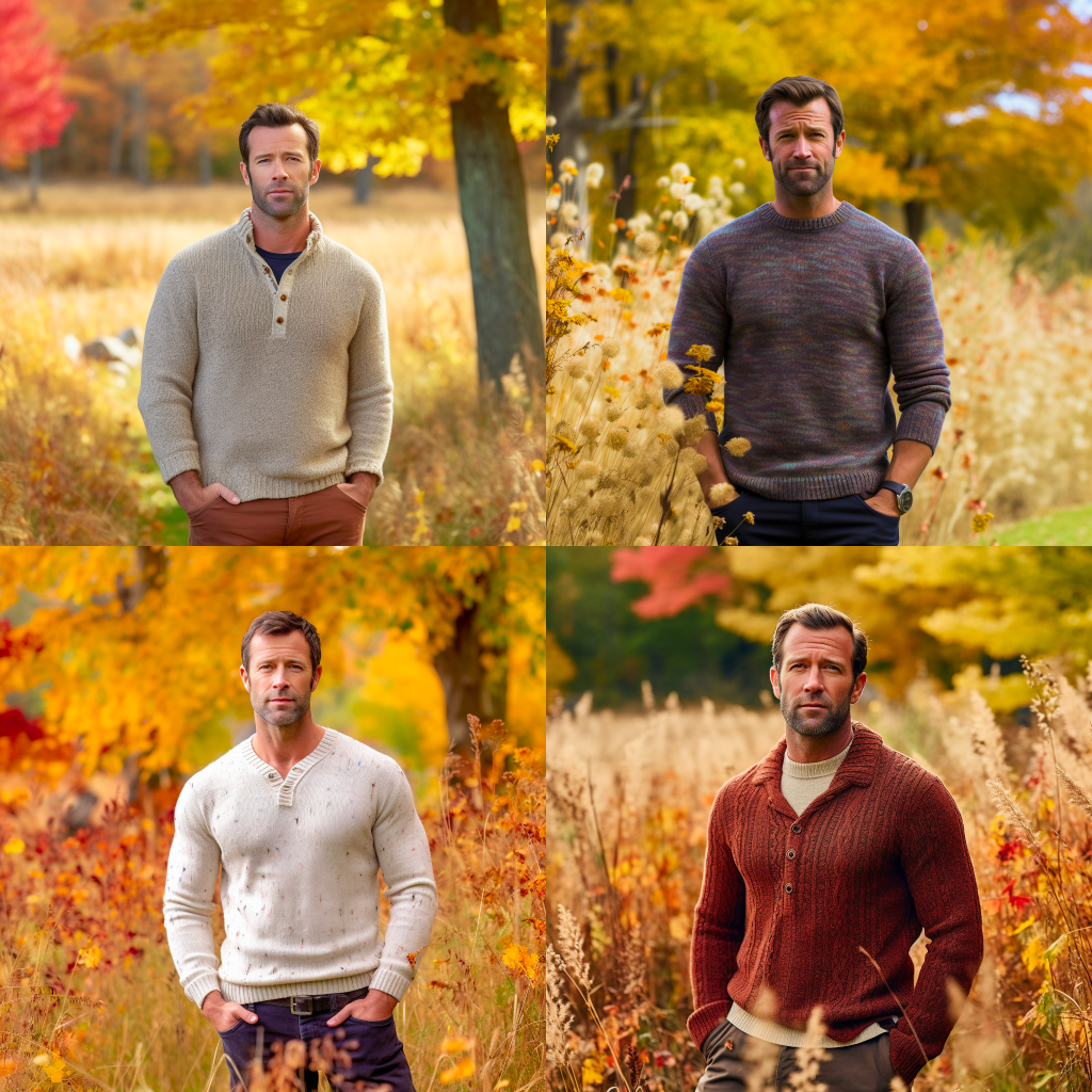 Alrighty, the clean shaven prompt helped, but the white house request isn’t helping. And I still don’t have a white cable knit sweater. Let’s see what happens when I include the “Stylize” command. This lets the AI be more creative in how it executes. The Stylize command also has a range of settings from 1 – 1000. I’ll put it on the highest setting to see what the difference is: